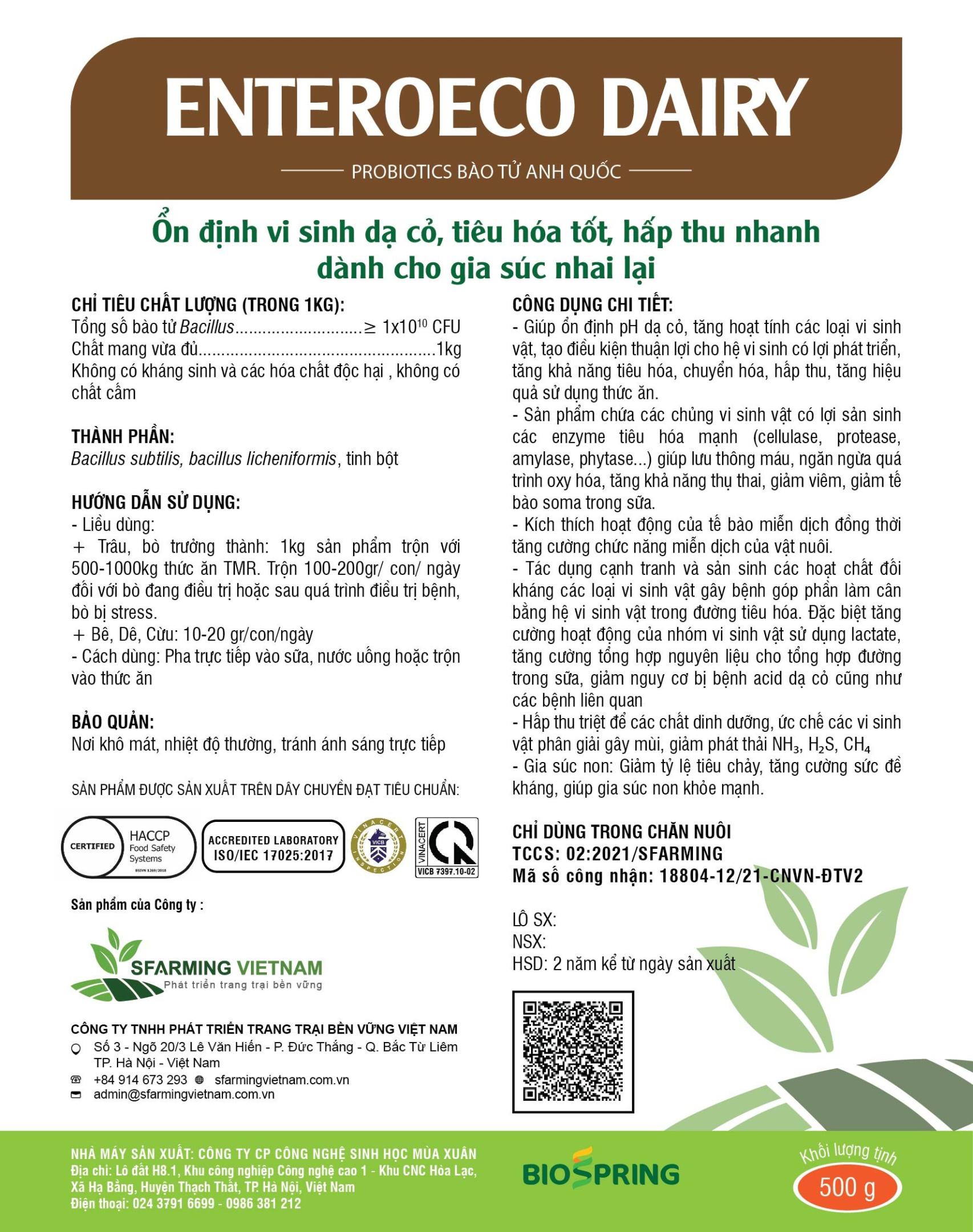 - ENTEROECO DAIRY là sản phẩm probiotics có chứa tổ hợp vi sinh vật có lợi với mật số cao, dạng bào tử, bền với các tác nhân sinh học, vật lý (có thể chịu được nhiệt ép viên lên đến 950C) được chuyển giao độc quyền từ Đại học Holloway, Anh Quốc.