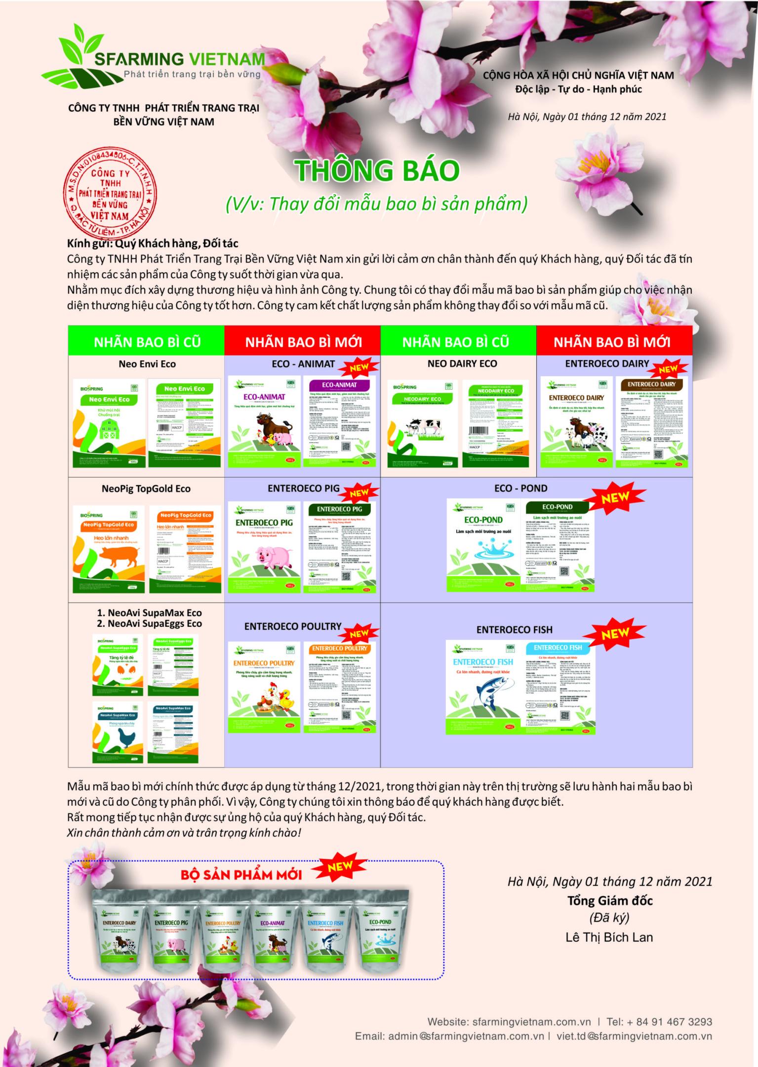 Tài liệu kỹ thuật, Tin tức - Sự kiện Thông báo: Về việc thay đổi nhãn mác, bao bì sản phẩm probiotics Posted on 01/12/202112/01/2022 by sfarmingvietnam Thông tin sản phẩm Men xử lý môi trường Eco-Animat Thông tin sản phẩm EnteroEco Dairy (Probiotics – Vi sinh vật có lợi)